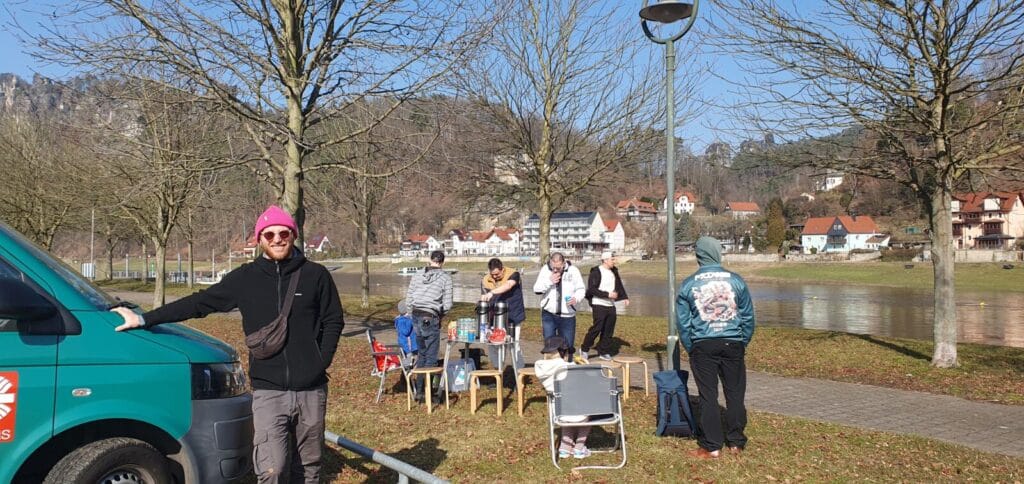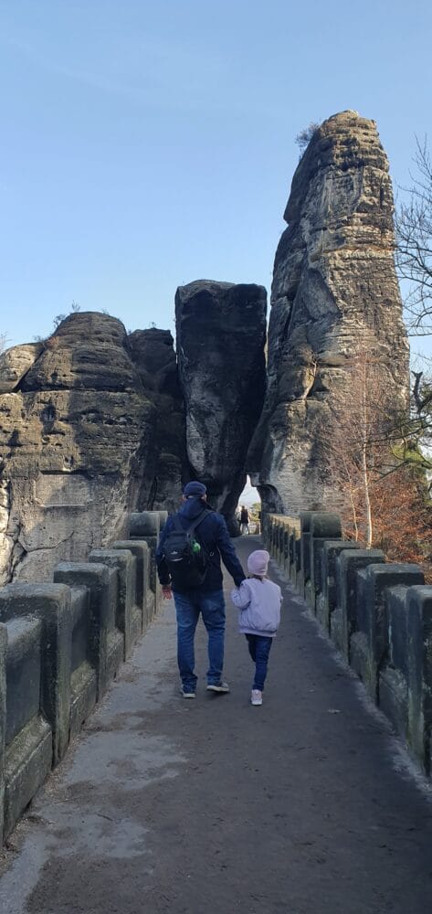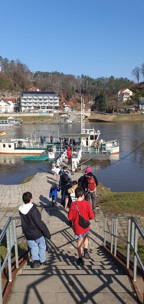 Mit zwei Transportern der Caritas waren wir am 28.02.2026 bei schönstem Frühlingswetter mit sechs Papas und sieben Kindern in der Sächsischen Schweiz. Mit der Fähre überquerten wir die Elbe und wanderten auf die Bastei. Alle Kinder und Papas genossen die Zeit draußen und die fantastische Aussicht. Wir freuen uns auf den nächsten gemeinsamen Ausflug!
