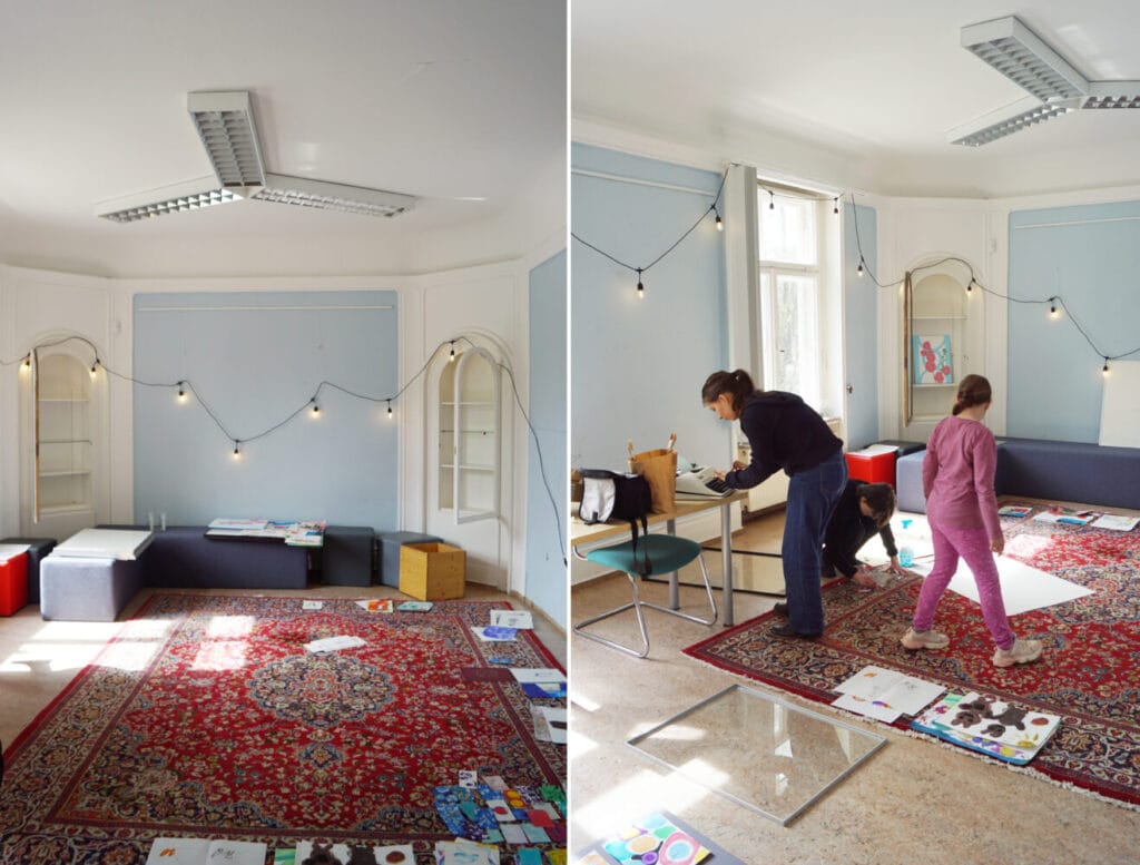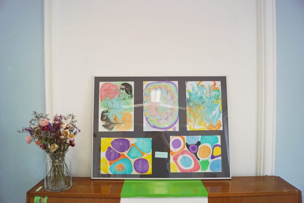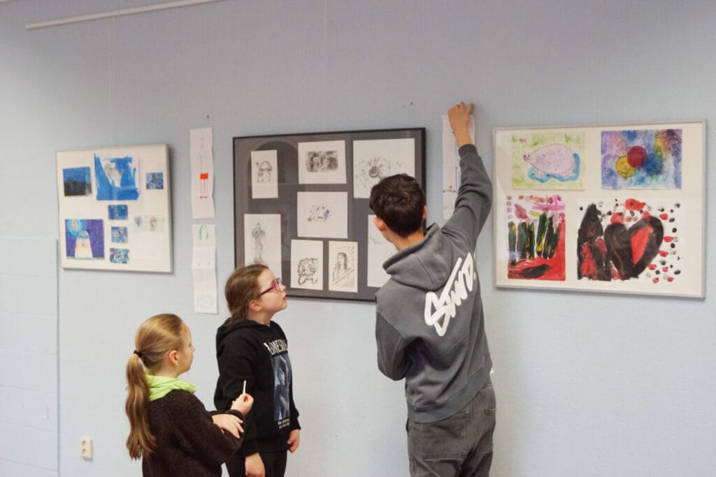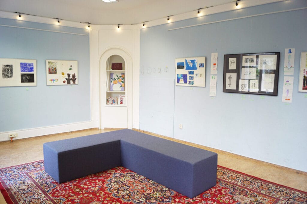 Die hier gezeigten Arbeiten geben einen Einblick in die eigenen Themen und Bildwelten der Kinder und Jugendlichen, die in den Kursen zeichnen, malen, drucken und gestalten. Mit viel Zeit, in kleinen Gruppen und ohne Notendruck erschließen sich die KursteilnehmerInnen Woche für Woche ihre Umwelt, von der Linie zur Fläche, über Schraffur und Struktur bis in den Raum. Dem Alter der SchülerInnen angepasst werden neue Techniken eingebracht, wie: im Wasserbad Papier zu marmorieren, Monotypien oder Linolschnitte zu drucken. Hierfür steht eine große Auswahl an Papieren und hochwertigen Künstlermaterialien zur Verfügung, die man so sonst nicht in jedem Federmäppchen findet.